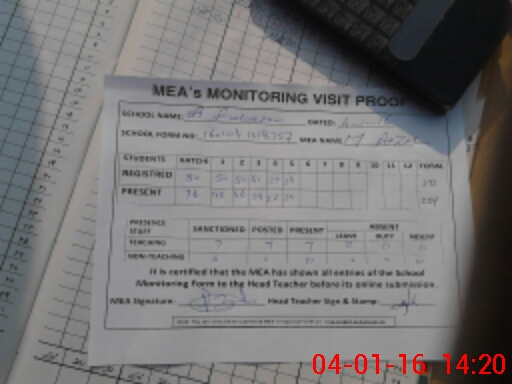 | Attendance Register | Head Teacher | MEA with School | Visit Proof |