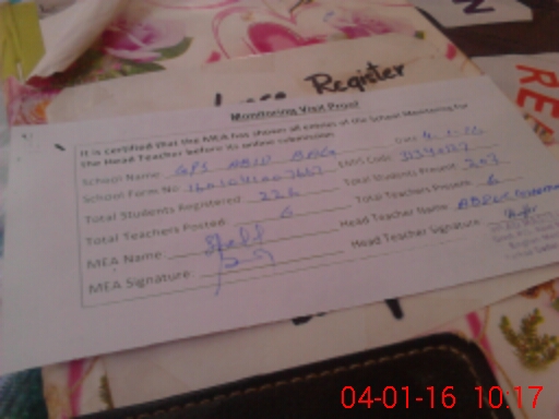 | Attendance Register | Head Teacher | MEA with School | Visit Proof |