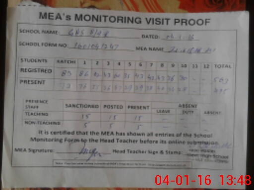 | Attendance Register | Head Teacher | MEA with School | Visit Proof |