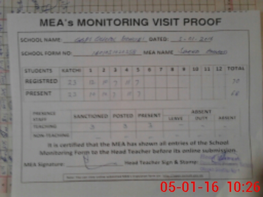 | Attendance Register | Head Teacher | MEA with School | Visit Proof |
