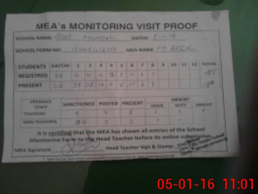 | Attendance Register | Head Teacher | MEA with School | Visit Proof |