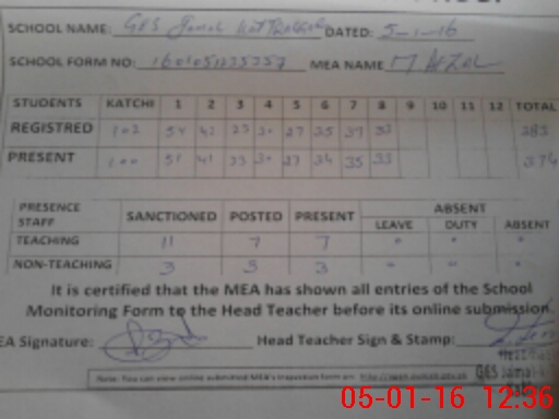 | Attendance Register | Head Teacher | MEA with School | Visit Proof |