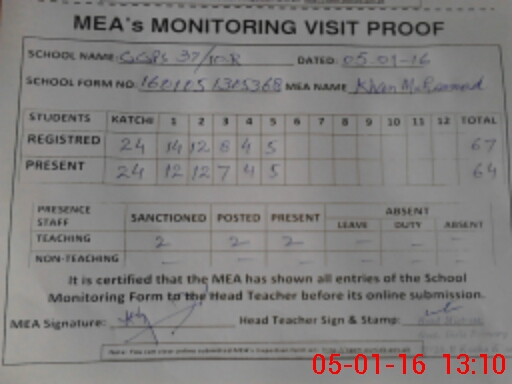 | Attendance Register | Head Teacher | MEA with School | Visit Proof |
