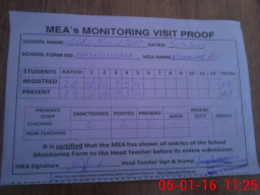 | Attendance Register | Head Teacher | MEA with School | Visit Proof |