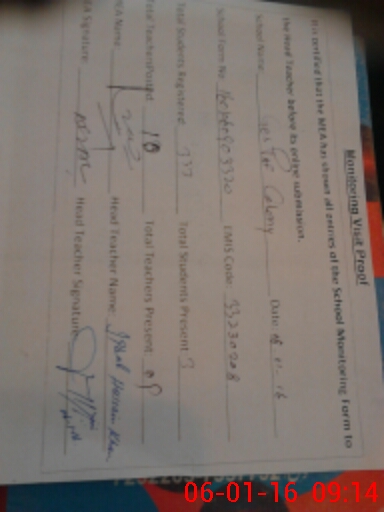 | Attendance Register | Head Teacher | MEA with School | Visit Proof |