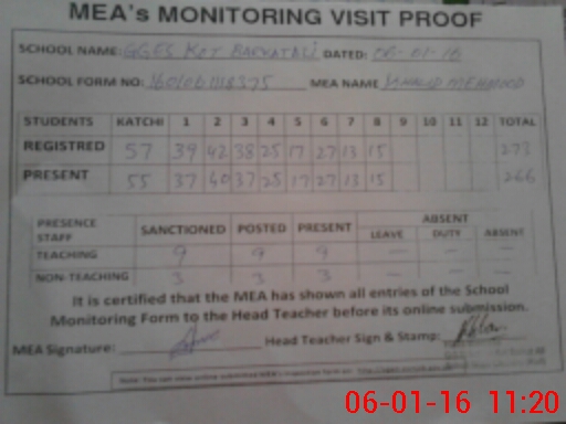 | Attendance Register | Head Teacher | MEA with School | Visit Proof |
