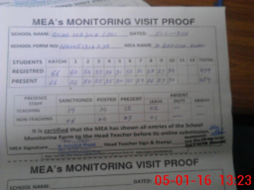 | Attendance Register | Head Teacher | MEA with School | Visit Proof |