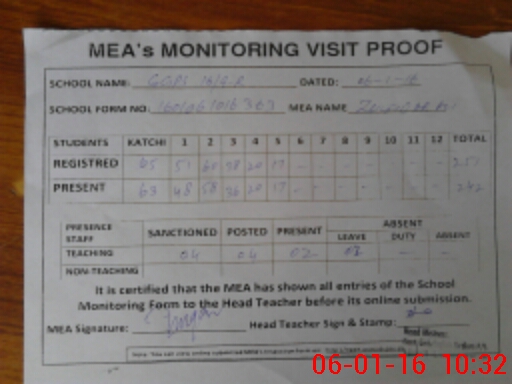 | Attendance Register | Head Teacher | MEA with School | Visit Proof |