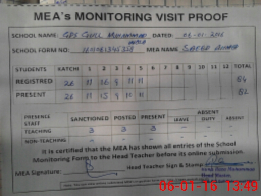 | Attendance Register | Head Teacher | MEA with School | Visit Proof |