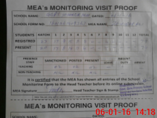 | Attendance Register | Head Teacher | MEA with School | Visit Proof |