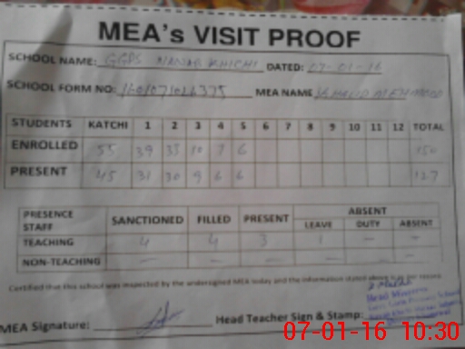 | Attendance Register | Head Teacher | MEA with School | Visit Proof |