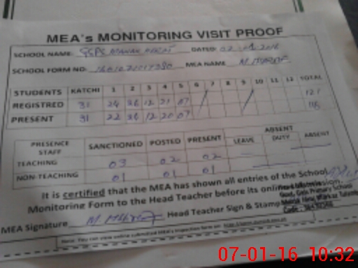 | Attendance Register | Head Teacher | MEA with School | Visit Proof |