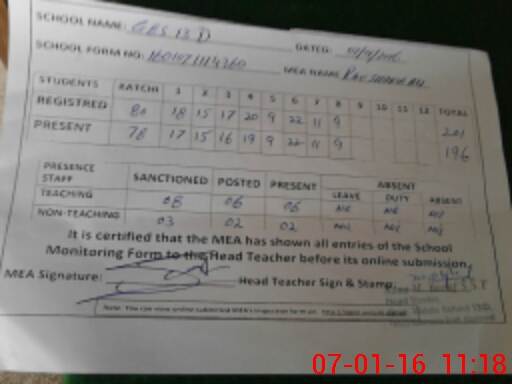 | Attendance Register | Head Teacher | MEA with School | Visit Proof |