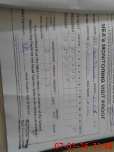 | Monitoring Date: 07-01-2016 | Start Time: 07-01-2016 11:08 AM | End Time: 07-01-2016 11:45 AM | Name of MEA: Z.**** M.Ej**** Ha**** | |
