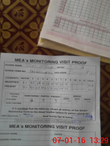| Attendance Register | Head Teacher | MEA with School | Visit Proof |