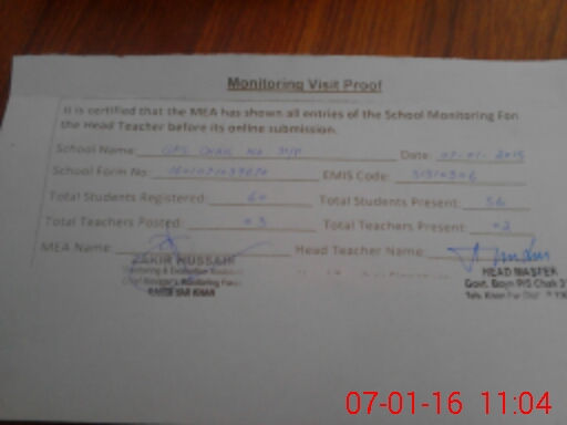 | EMIS Code: 31310306 | Name of School: GPS CHAK NO. 31/P. P.O. BAGHO BEHAR | |||