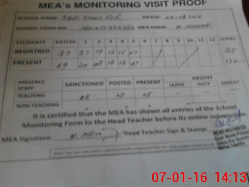 | Attendance Register | Head Teacher | MEA with School | Visit Proof |