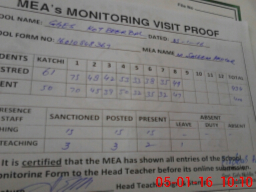 | Attendance Register | Head Teacher | MEA with School | Visit Proof |