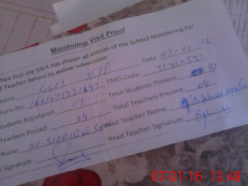 | Attendance Register | Head Teacher | MEA with School | Visit Proof |