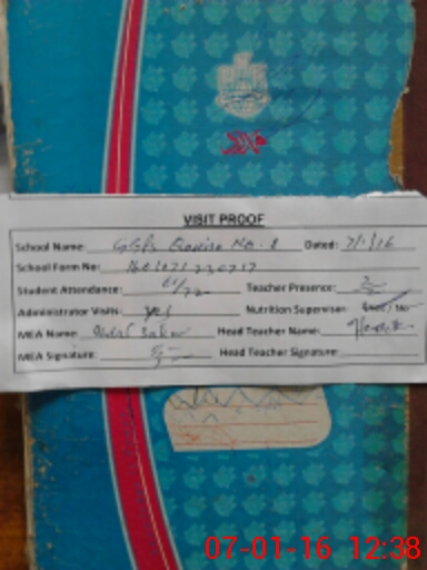 | School Visited by School Health & Nutrition Supervisor (No. of Visits) | 1 | Name1: | Zahoor Hussain | Name2: | |