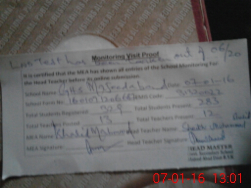 | Certified that this School was Inspected by the Undersigned MEA/DMO Today and the Information Stated Above is as Per Record. | |||||