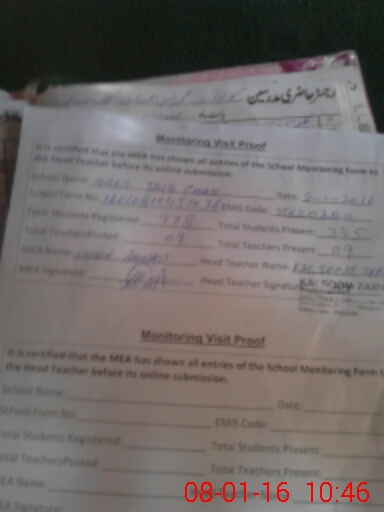 | School Visited by School Health & Nutrition Supervisor (No. of Visits) | 1 | Name1: | IMRANUREHMAN | Name2: | |