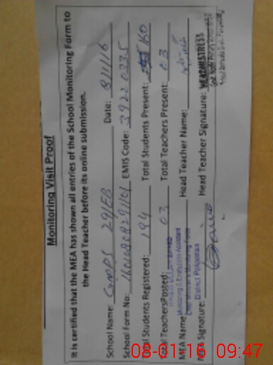 | Attendance Register | Head Teacher | MEA with School | Visit Proof |
