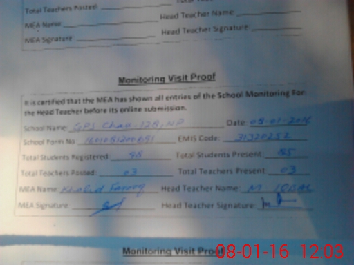 | Attendance Register | Head Teacher | MEA with School | Visit Proof |