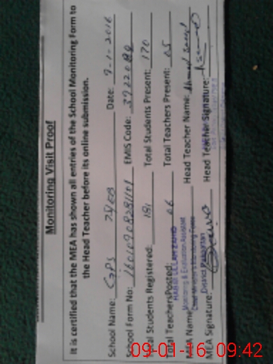 | School Visited by School Health & Nutrition Supervisor (No. of Visits) | 1 | Name1: | mushtaq ahmed | Name2: | |