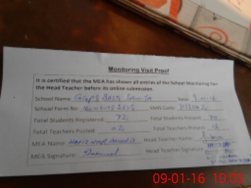 | Attendance Register | Head Teacher | MEA with School | Visit Proof |