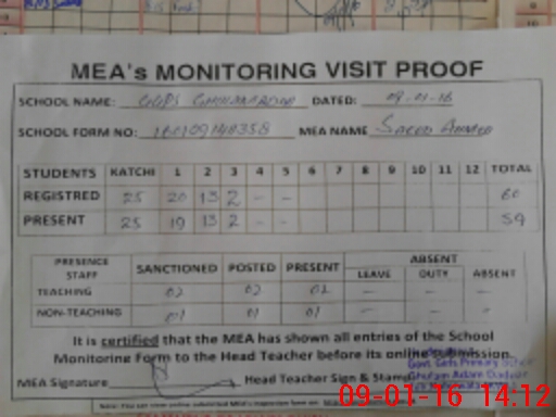 | Attendance Register | Head Teacher | MEA with School | Visit Proof |