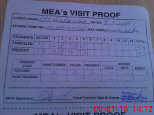 | Attendance Register | Head Teacher | MEA with School | Visit Proof |