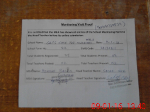| Attendance Register | Head Teacher | MEA with School | Visit Proof |
