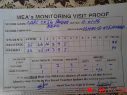 | Attendance Register | Head Teacher | MEA with School | Visit Proof |