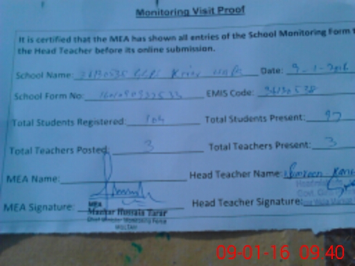 | Attendance Register | Head Teacher | MEA with School | Visit Proof |