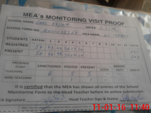 | Attendance Register | Head Teacher | MEA with School | Visit Proof |