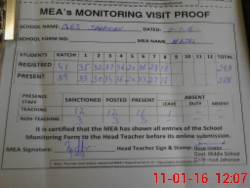 | Attendance Register | Head Teacher | MEA with School | Visit Proof |