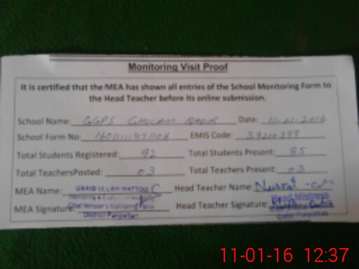 | Attendance Register | Head Teacher | MEA with School | Visit Proof |