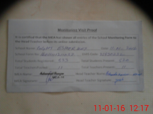 | Attendance Register | Head Teacher | MEA with School | Visit Proof |