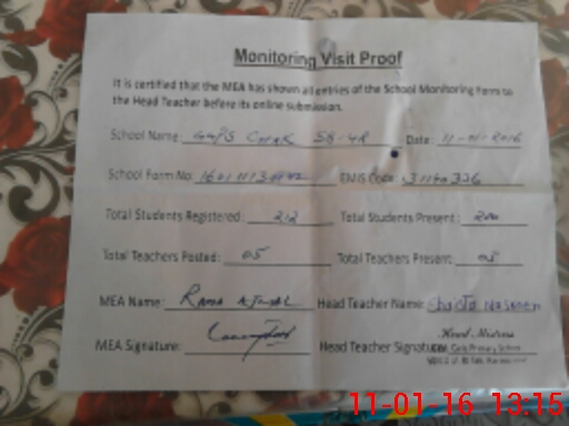 | Attendance Register | Head Teacher | MEA with School | Visit Proof |