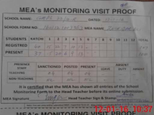 | Attendance Register | Head Teacher | MEA with School | Visit Proof |