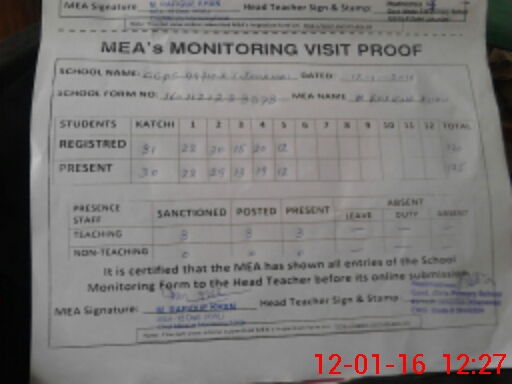 | Attendance Register | Head Teacher | MEA with School | Visit Proof |