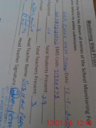 | Attendance Register | Head Teacher | MEA with School | Visit Proof |