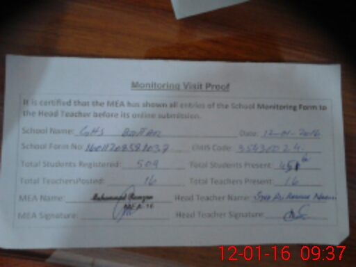 | Certified that this School was Inspected by the Undersigned MEA/DMO Today and the Information Stated Above is as Per Record. | |||||