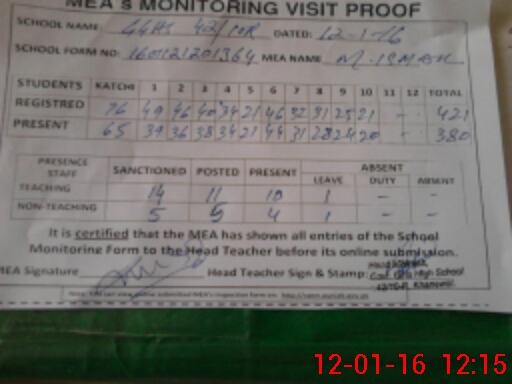 | Attendance Register | Head Teacher | MEA with School | Visit Proof |