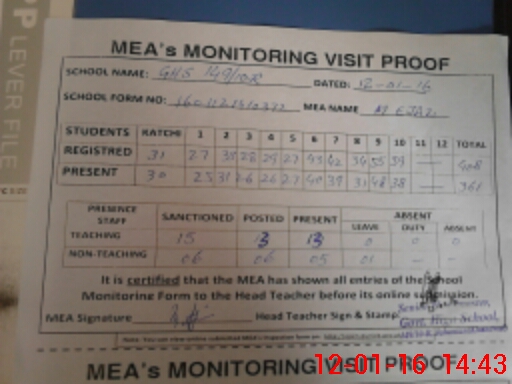 | Attendance Register | Head Teacher | MEA with School | Visit Proof |