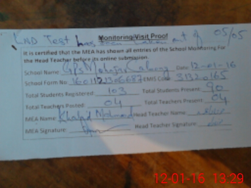 | EMIS Code: 31320165 | Name of School: GPS MAHAJAR COLONY ALLAH ABAD | |||