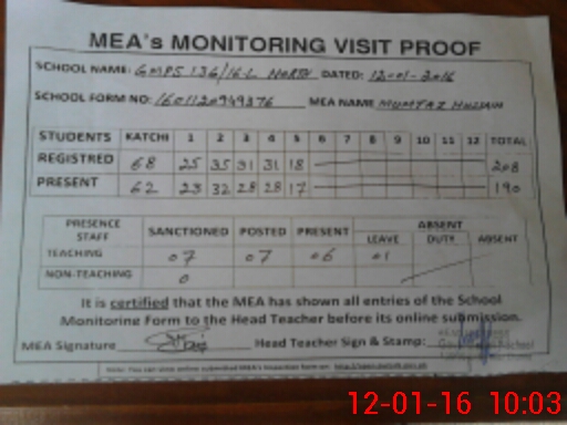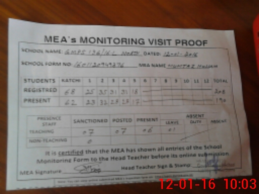 | Attendance Register | Head Teacher | MEA with School | Visit Proof |