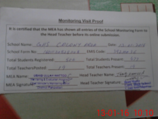| EMIS Code: 39210036 | Name of School: GHS COLONY AREA PAKPATTAN | |||