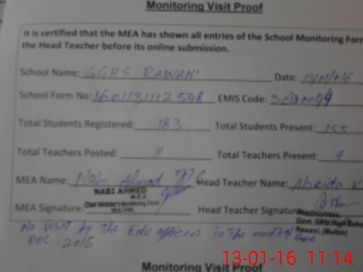 | EMIS Code: 36130094 | Name of School: GGHS RAWANI MULTAN | |||